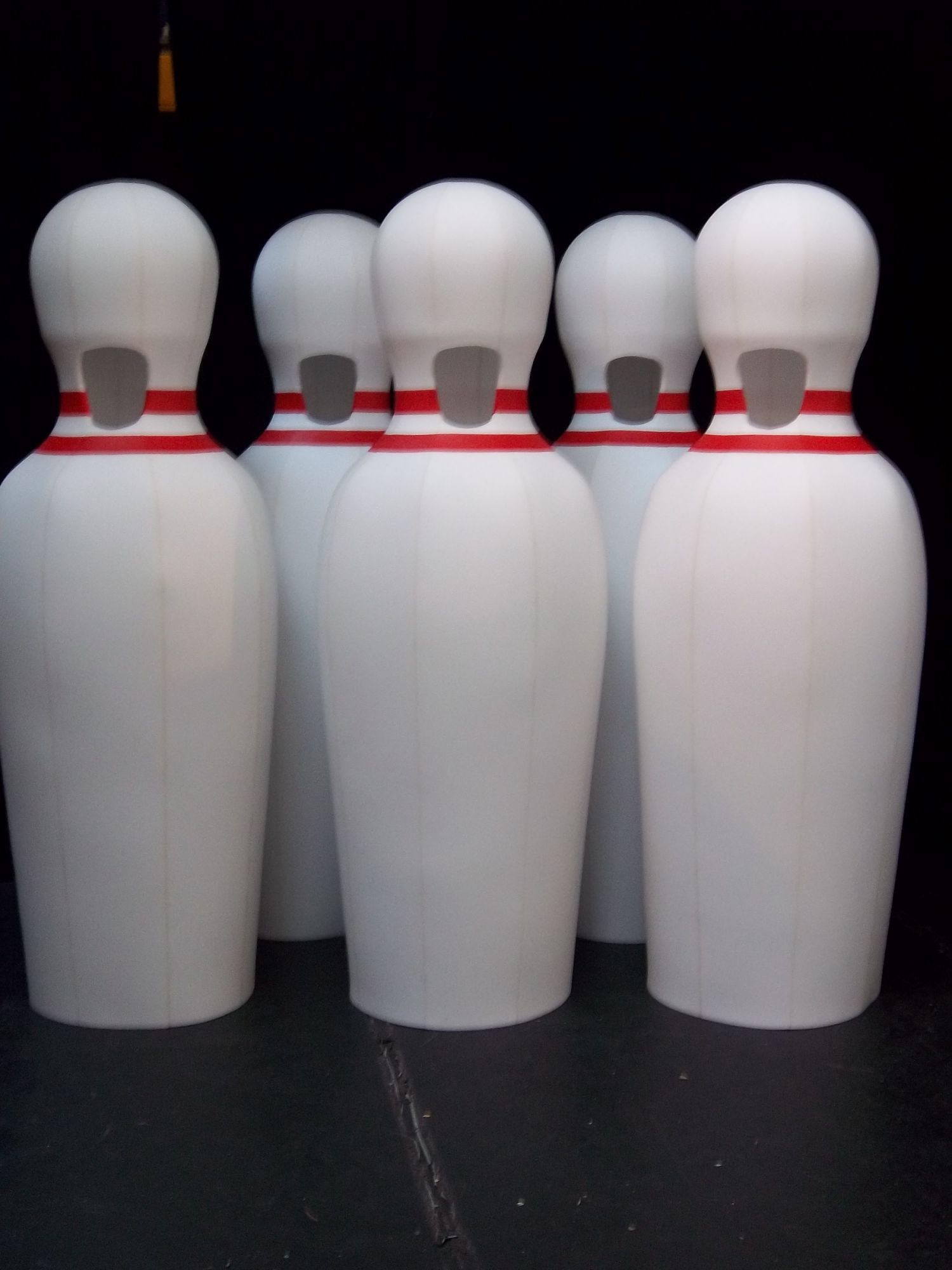 Création et Fabrication de cinq quilles de bowling à taille humaine par l’agence Posterscop,