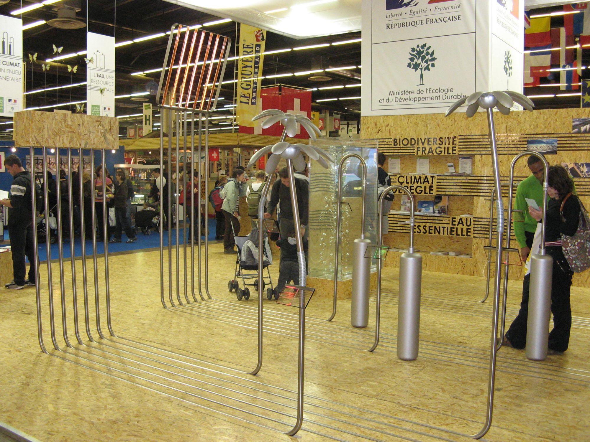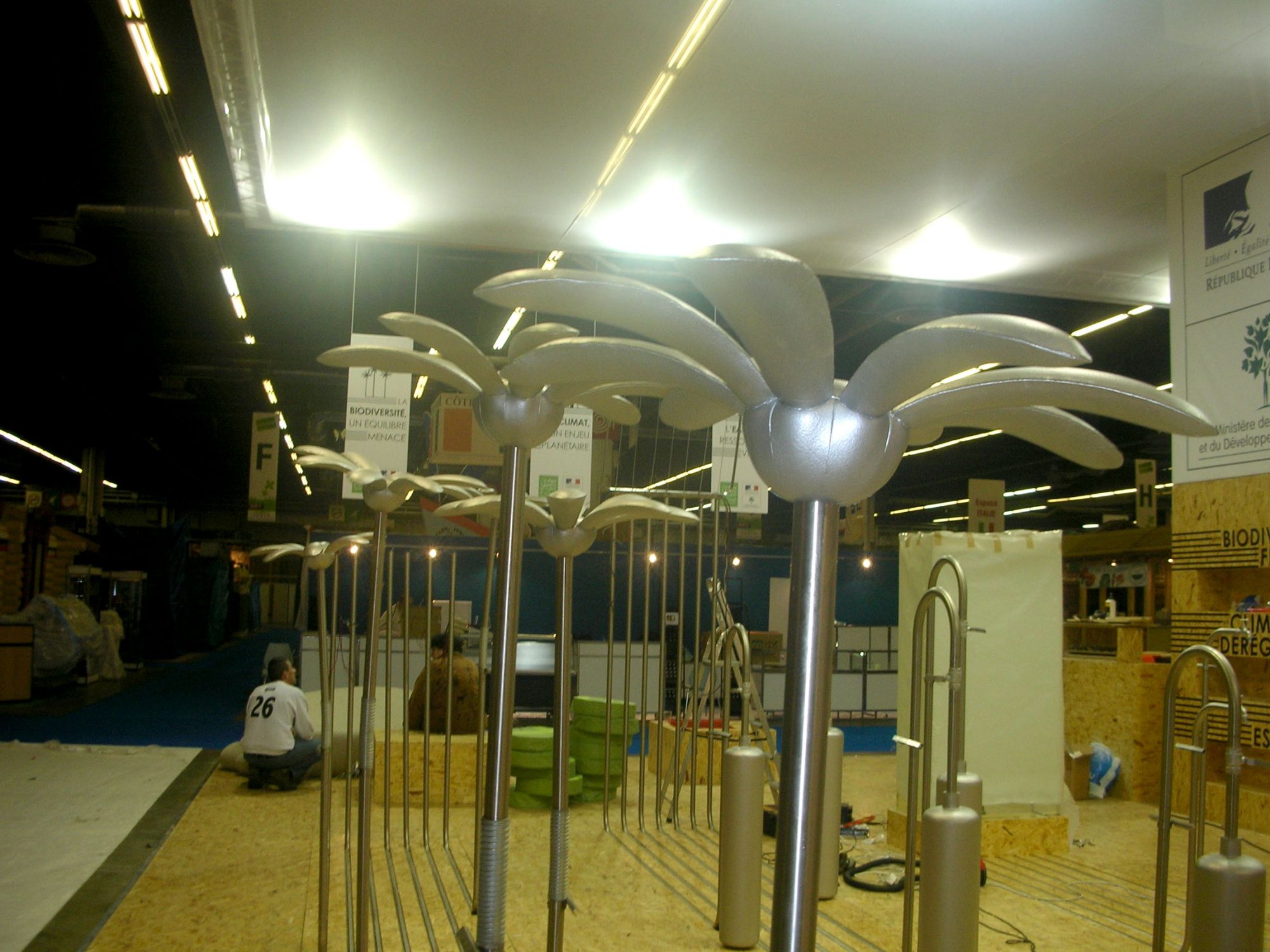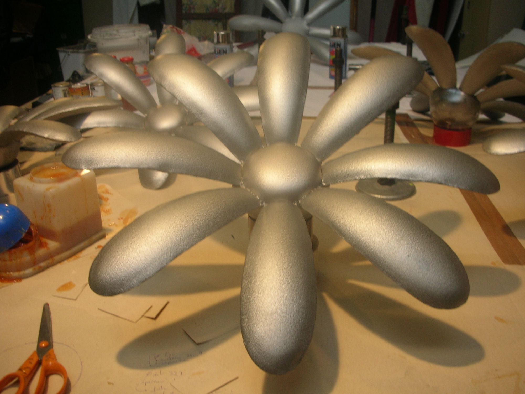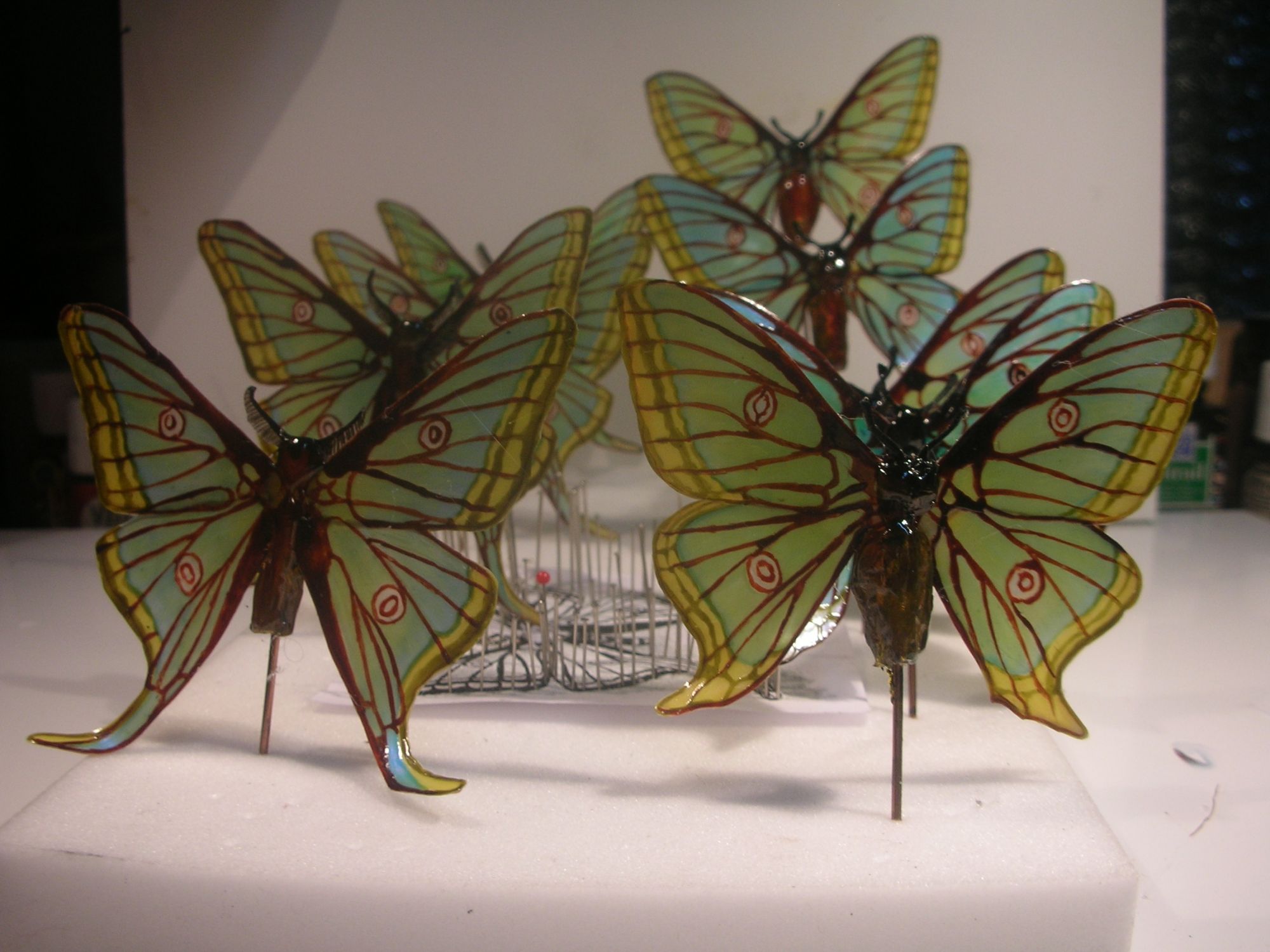 Réalisation de sept fleurs et de sept bombonnes à aspect métallique, puis de sept papillons évoquant